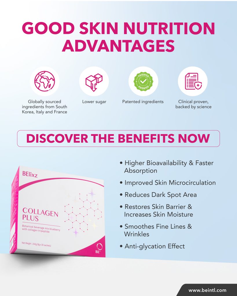 As it is formulated to replenish our skin from the inside out, BElixz COLLAGEN PLUS goes beyond ‘surface-level treatment’ with its combination of advanced collagen science and carefully selected ingredients, helping you to achieve a younger-looking, fresh, and healthy skin.