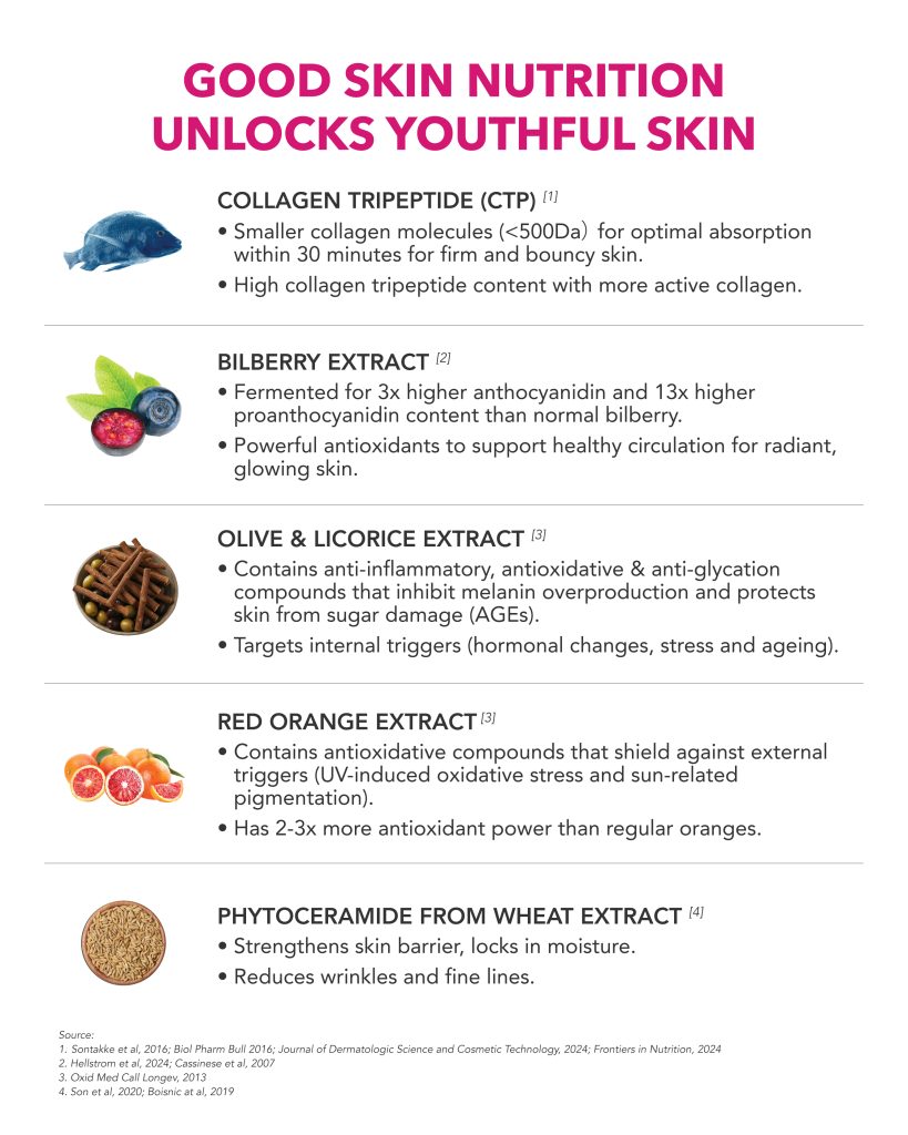 A breakthrough collagen drink, formulated with patented and advanced Collagen Tripeptide, combined with beneficial antioxidants (a proprietary blend of botanical extracts) to deliver enhanced skin benefits. BElixz COLLAGEN PLUS is designed to support firmer, bouncier skin, promote a radiant, glowing complexion, and help maintain smooth, flawless skin. Easy to enjoy every day, it nourishes from within to reveal healthy, youthful-looking skin.